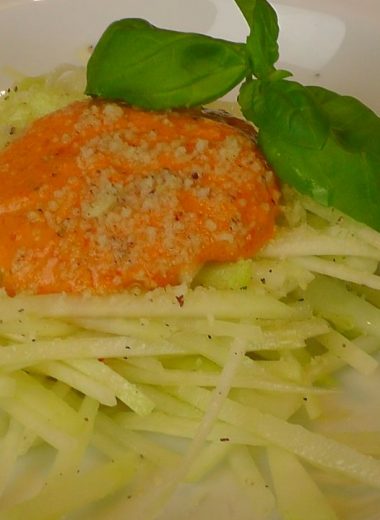 Aus Kohlrabi lassen sich auch hervorragend Rohkostnudeln herstellen. Hierfür wird es entweder sehr klein geschnitten (wie im Video) oder mithilfe eines Spiralschneiders in die Nudelform gebracht. Anschließend werden sie marinierte. So sind sie nachher zart im Biss. Dazu gibt es eine kalte Tomatensoße und einen Parmesan aus Paranüssen. Das Rezept […]