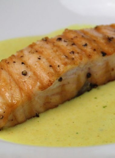 Gebratener Lachs mit gewürzter Kokosnussmilch.